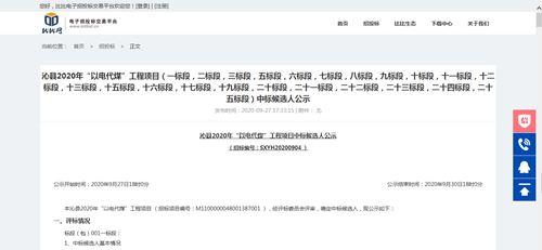 9月27日,2020年山西沁縣“以電代煤”工程項(xiàng)目中標(biāo)候選人公示,經(jīng)專家委員會(huì)評(píng)審,綠特成功中標(biāo),再下一城。