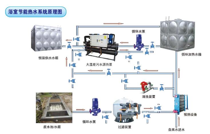 浴室節(jié)能熱水系統(tǒng)主要由大溫差污水源熱泵機(jī)組、砂濾罐、預(yù)熱板式換熱器械、清洗裝置、循環(huán)加熱水箱、蓄熱供水箱、相應(yīng)循環(huán)水泵及連接管路等組成,用于浴室的廢水熱能回收,將洗浴廢水與大溫差污水源熱泵系統(tǒng)進(jìn)行換熱,提高自來(lái)水的進(jìn)水溫度,然后在大溫差污水源熱泵系統(tǒng)中進(jìn)行加熱,充分利用洗浴廢水中的熱能,有效提高洗浴熱水的出水溫度,節(jié)能環(huán)保,具有很好的實(shí)用性。同時(shí),在夏季時(shí),可以利用污水源熱泵制取冷凍水,用于房間內(nèi)部需要供冷的場(chǎng)所,如大廳、客房等。